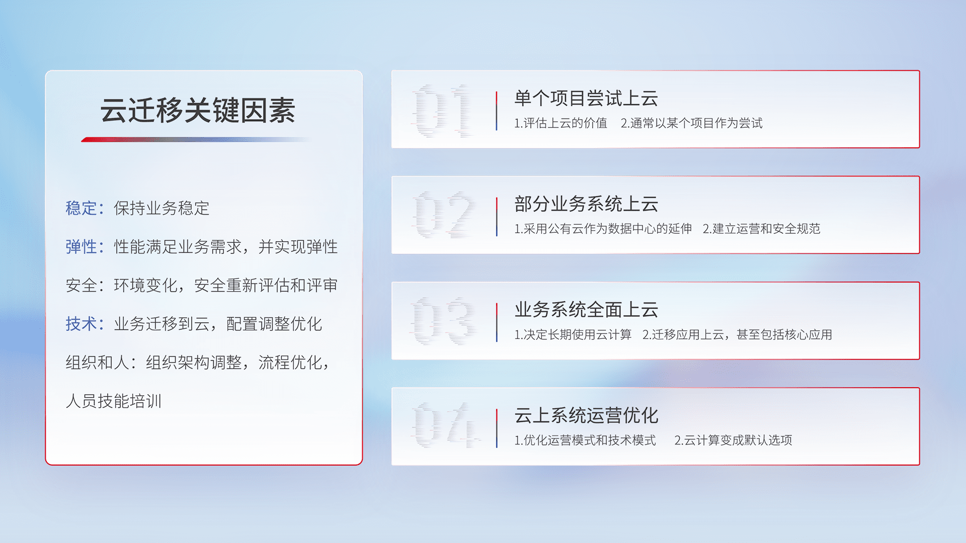 结合实际业务,,从规划设计、、、云平台选型、、、云原生改造、、、、数据迁移、、集成交付,,,迁移全过程为客户识别最佳上云路径,,,,做好风险识别管理,,,设计网络架构、、身份权限、、、安全审计合规、、操作审计、、、、日志审计、、、、监控告警策略、、多站点容灾设计等,,,,对云上基础设施进行整体规划,,,提升IT治理水平,,以满足弹性、、高可用、、、高性能的需求。。